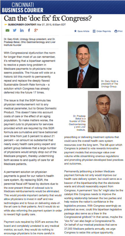 Dr. Gary Kirsh co-authored an opinion piece with Dr. Pradeep Bekal, a founder of Ohio Gastroenterology and Liver Institute, on the national SGA (Sustainable Growth Rate) formula solution currently being debated in Congress. The House recently voted for the fix and the Senate is expected to vote by the end of April 2015.